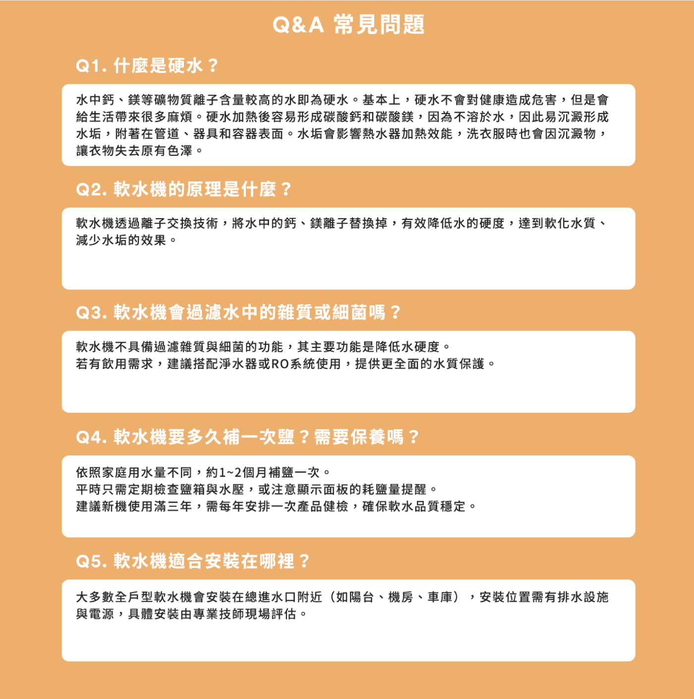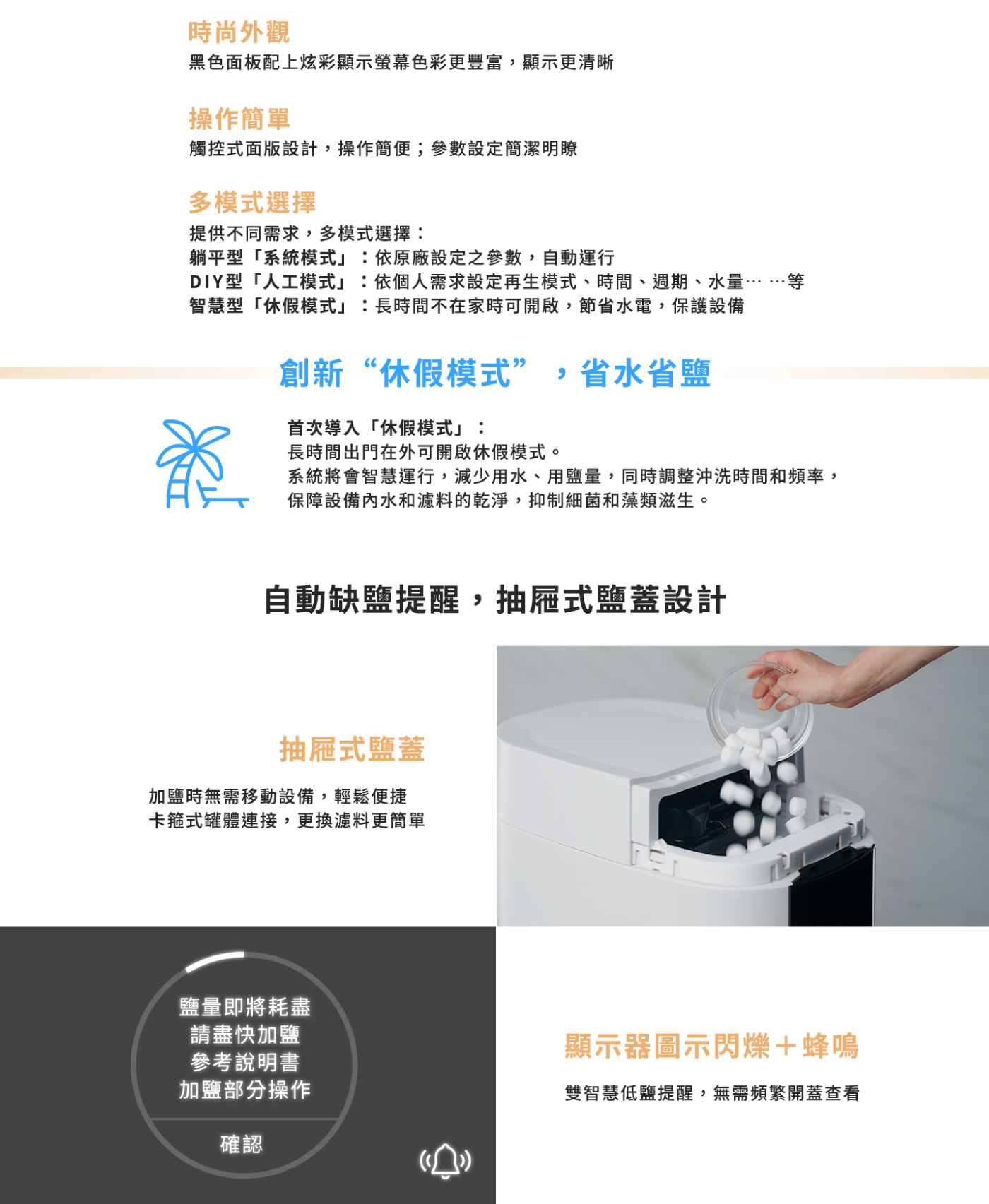 注意事項:建議每2-3個月(視水質及使用量而定)檢查桶內鹽量是否足夠。