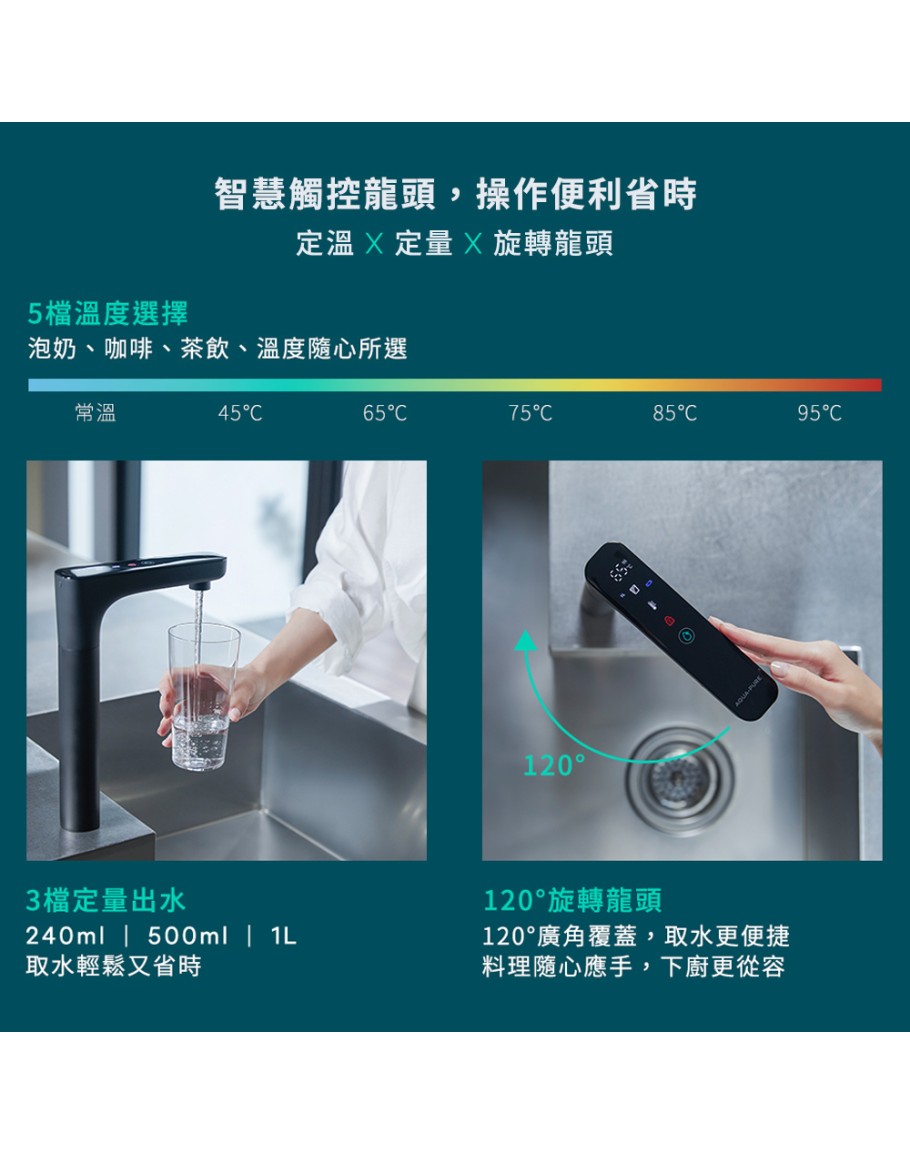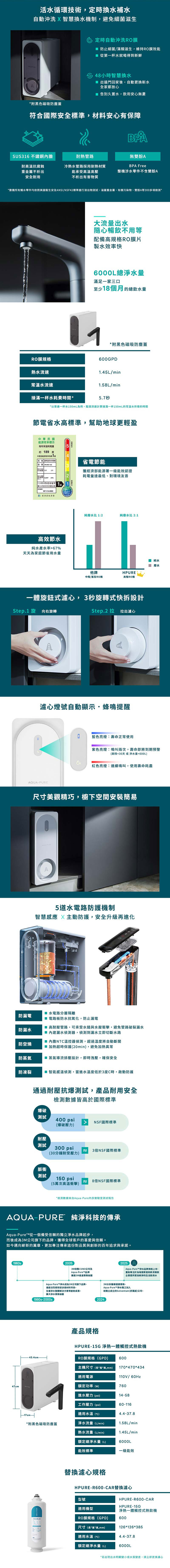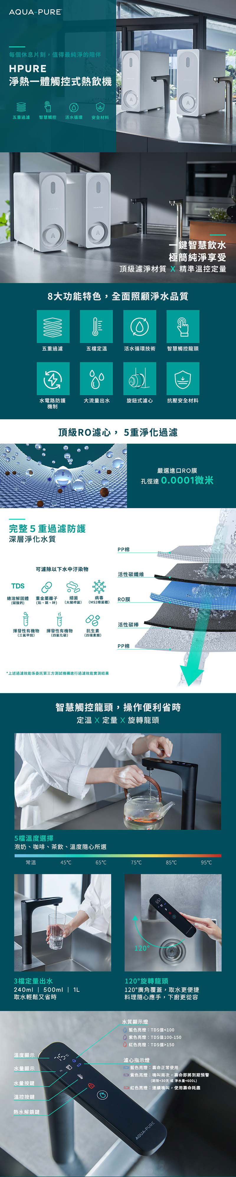 ◆ 過濾 加熱,淨熱一體。 ◆五重濾材層層過濾,搭配600GPD RO膜,高效去除水中汙染物。 ◆五道安全防護機制,防漏電、防漏水、防空燒、防蒸氣、防凍裂。 ◆五檔溫度選擇 (45/65/75/85/95°C),滿足各種溫度需求。 ◆2.1L大容量儲水箱,三段定量出水(240/ 500/1000ml),取水輕鬆又省時。 ◆材料、部件、整機通過高標準強度測試,安全可靠。 ◆一級能效,節能省電。